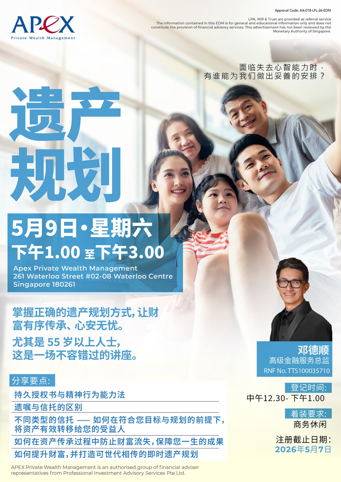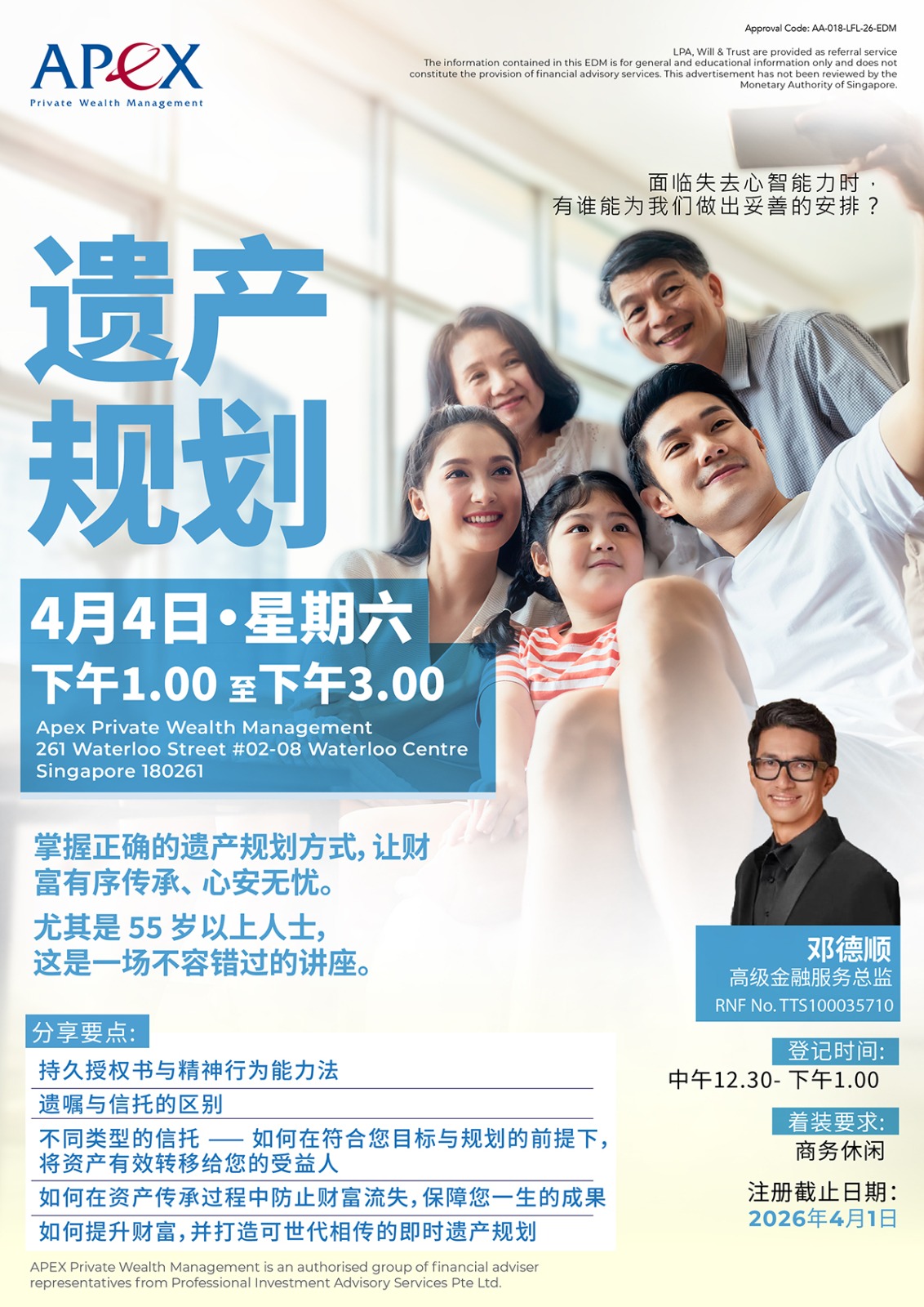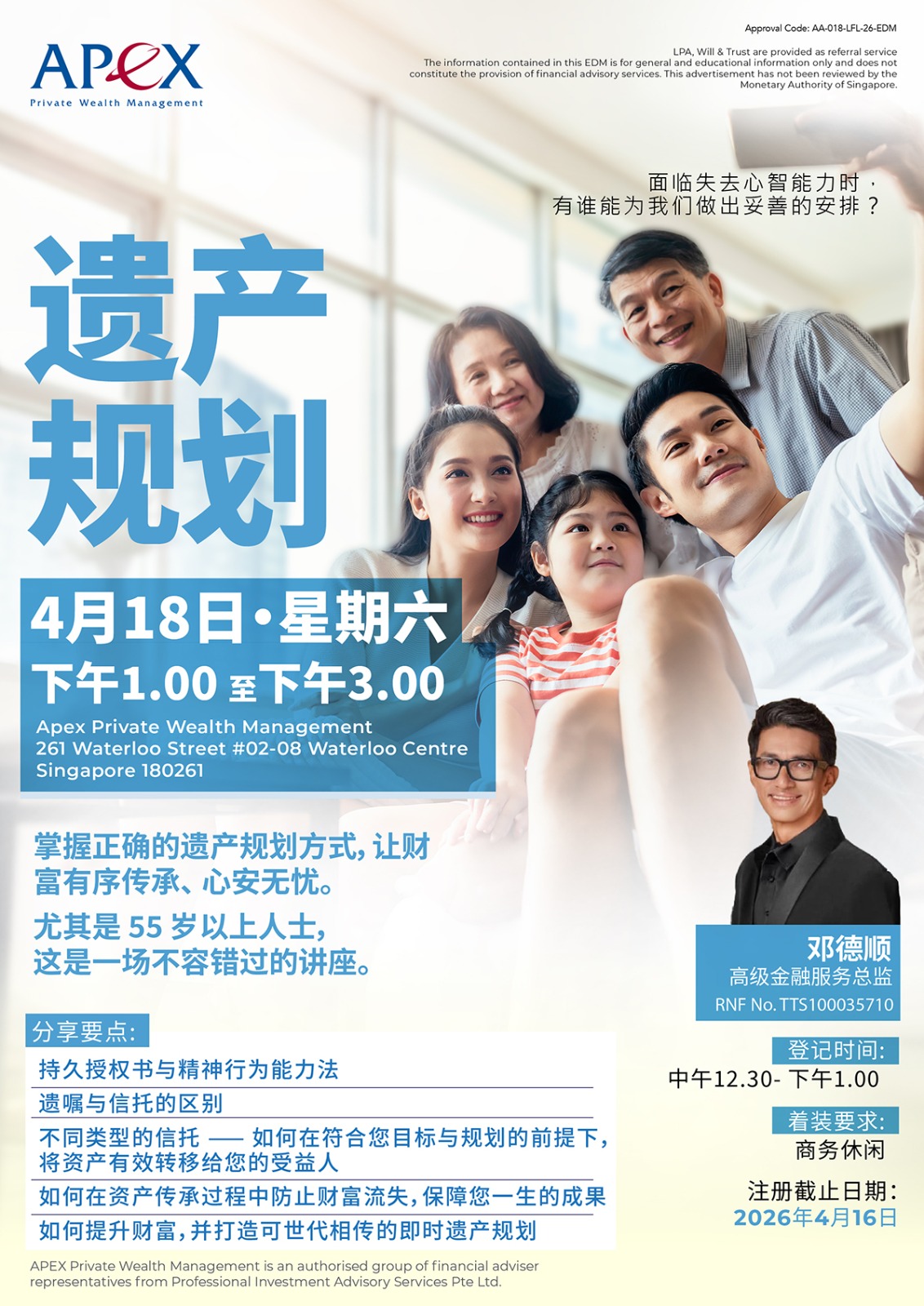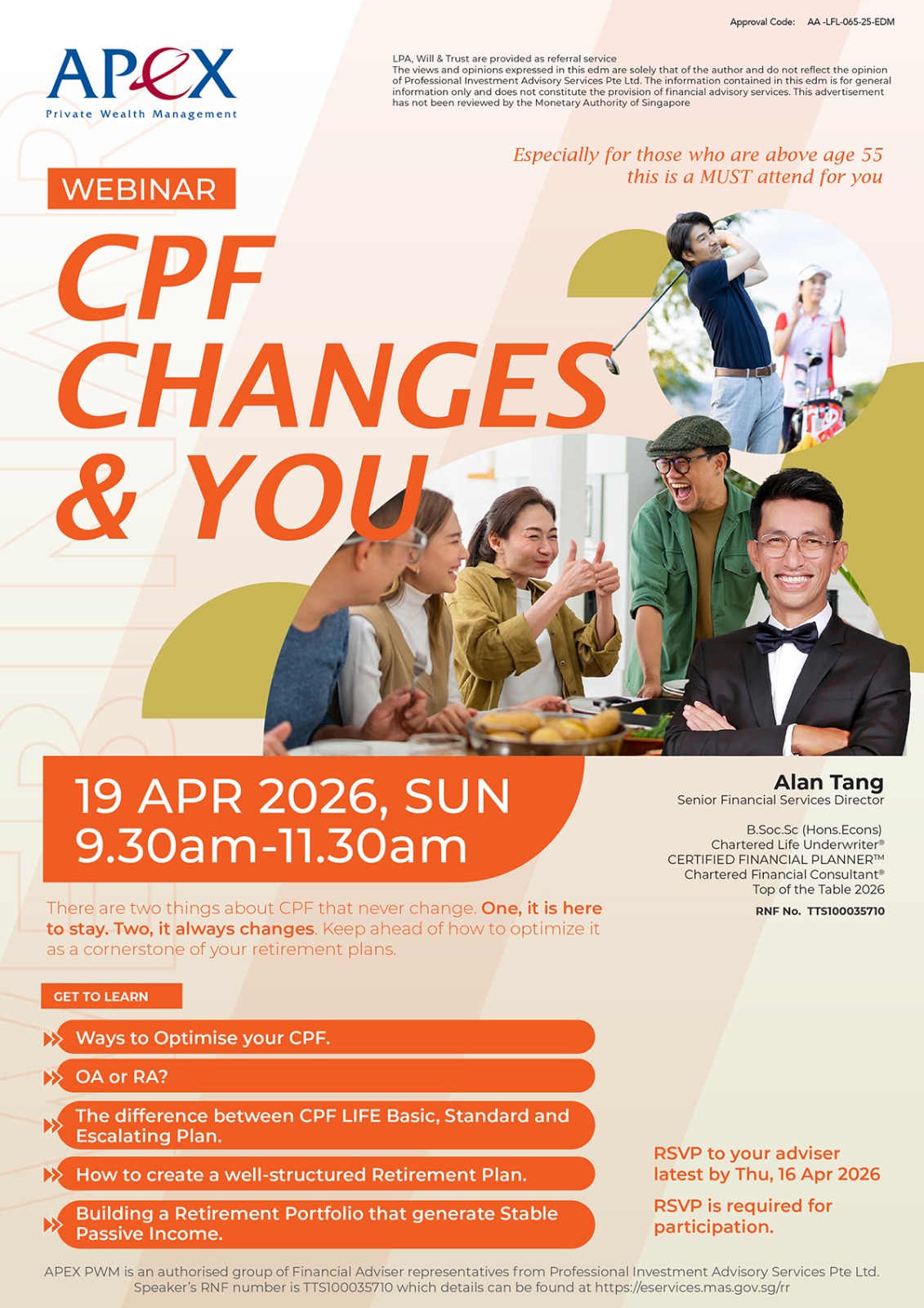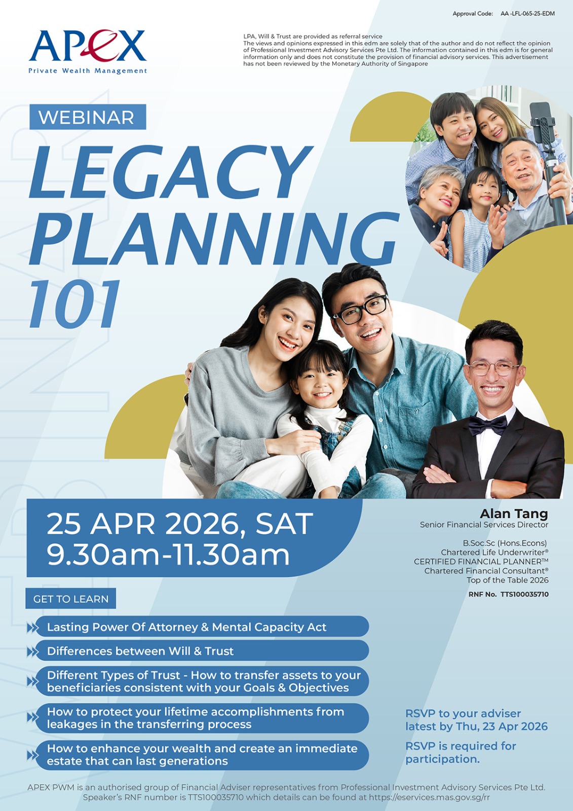 LPA, Will & Trust are provided as referral service. The views and opinions expressed in this edm are solely that of the author and do not reflect the opinion of Professional Investment Advisory Services Pte Ltd. The information contained in this edm is for general information only and does not constitute the provision of financial advisory services. This advertisement has not been reviewed by the Monetary Authority of Singapore.